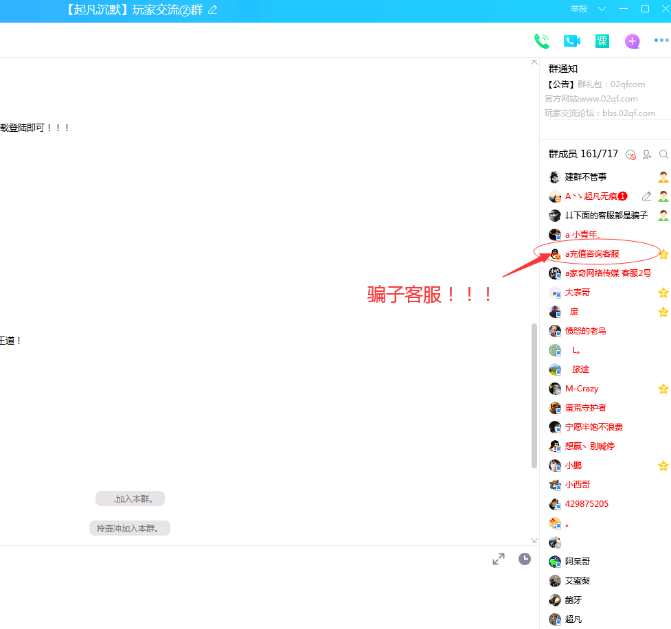 经常会出现  充值转区客服,因为在线设置为Q我吧 也是会员,会排在QQ群管理下方,不注意的玩家以为是客服!实际是骗子,已经有很多玩家被骗,请大家擦亮双眼,认准客服QQ:3011381,或则群管理!不要轻易相信他人!!!